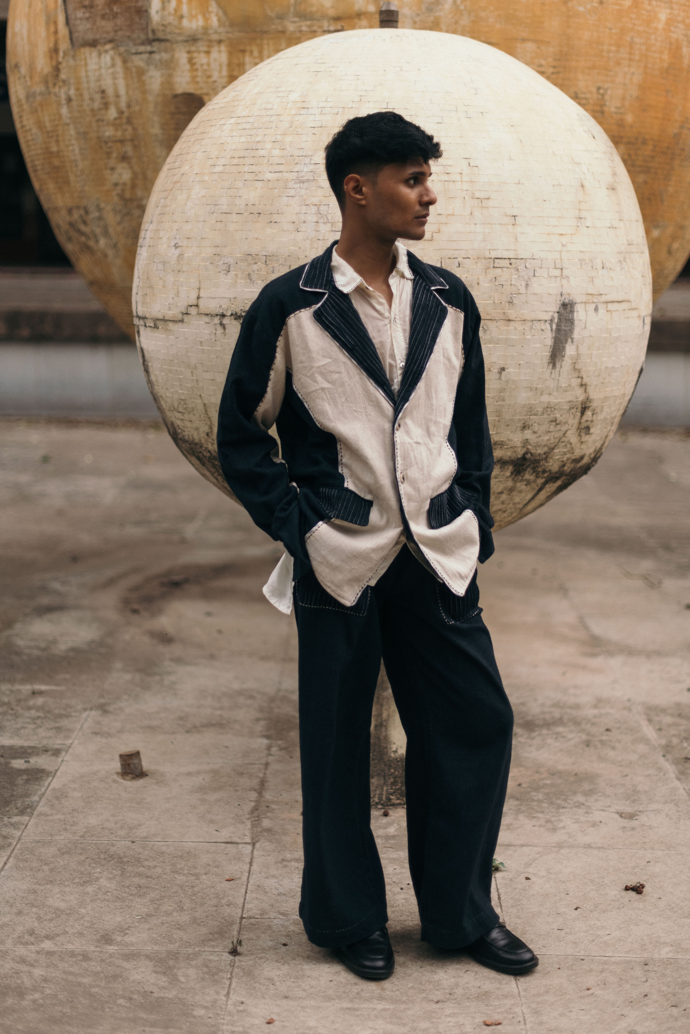 Crafted from 100% cotton fibres and natural materials, this Blazer brings together undyed, unbleached Kala cotton and azo-free dyed Midnight Black cotton in quiet contrast. The combination offers depth through material and tone, grounding the piece in both form and function.