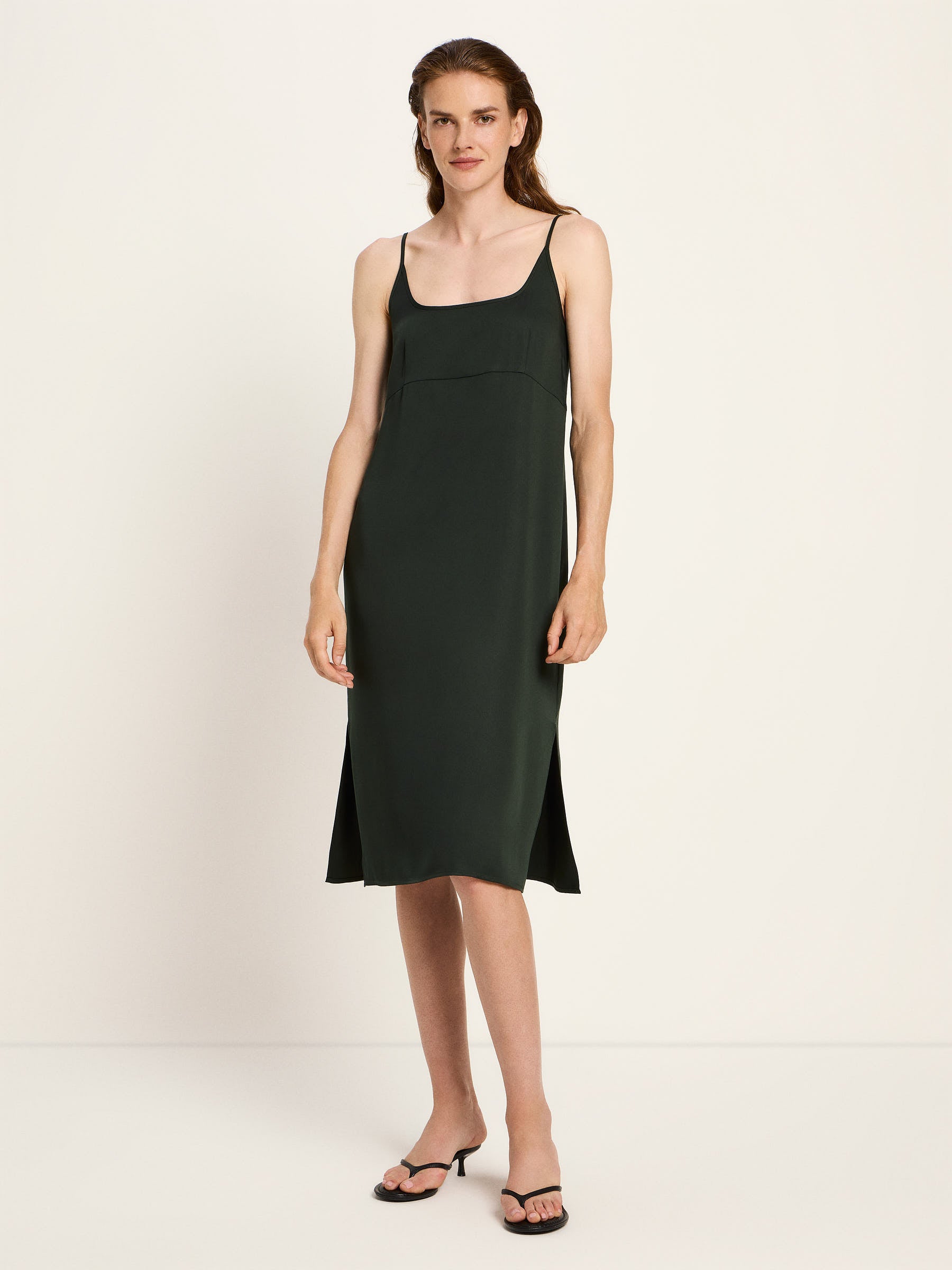 Der natürliche Glanz des Materials und der weich fallende, cleane Schnitt verleihen dem Kleid eine moderne Schlichtheit mit femininer Ausstrahlung. Schmale, verstellbare Träger sorgen für individuellen Sitz, während die minimalistische Form vielseitiges Styling ermöglicht – solo getragen, unter Strick oder als Layering-Piece. Vegan gefertigt – für bewusste Looks mit Leichtigkeit.