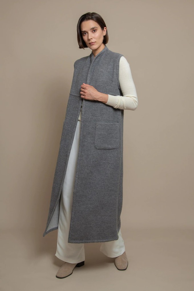 Long reversible vest with a relaxed fit, slightly widening from the hip to the ankle. Features a high, round collar, giving it a more elegant aesthetics. Both sides are symmetrical. Despite its simplicity, it presents a seam detail bellow the chest area and two side pockets on both sides. Adding up to its natural softness, the alpaca-blend fabric used is also very lightweight yet warm.