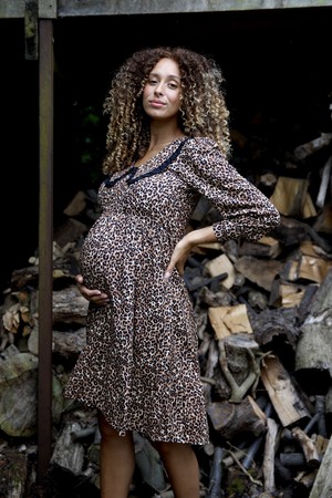 She’s a nursing dress that really will become your forever favourite. The combo of her classic leopard and contrast collar frill are a dream; a maternity and nursing dress that is super flattering and undeniably feminine.