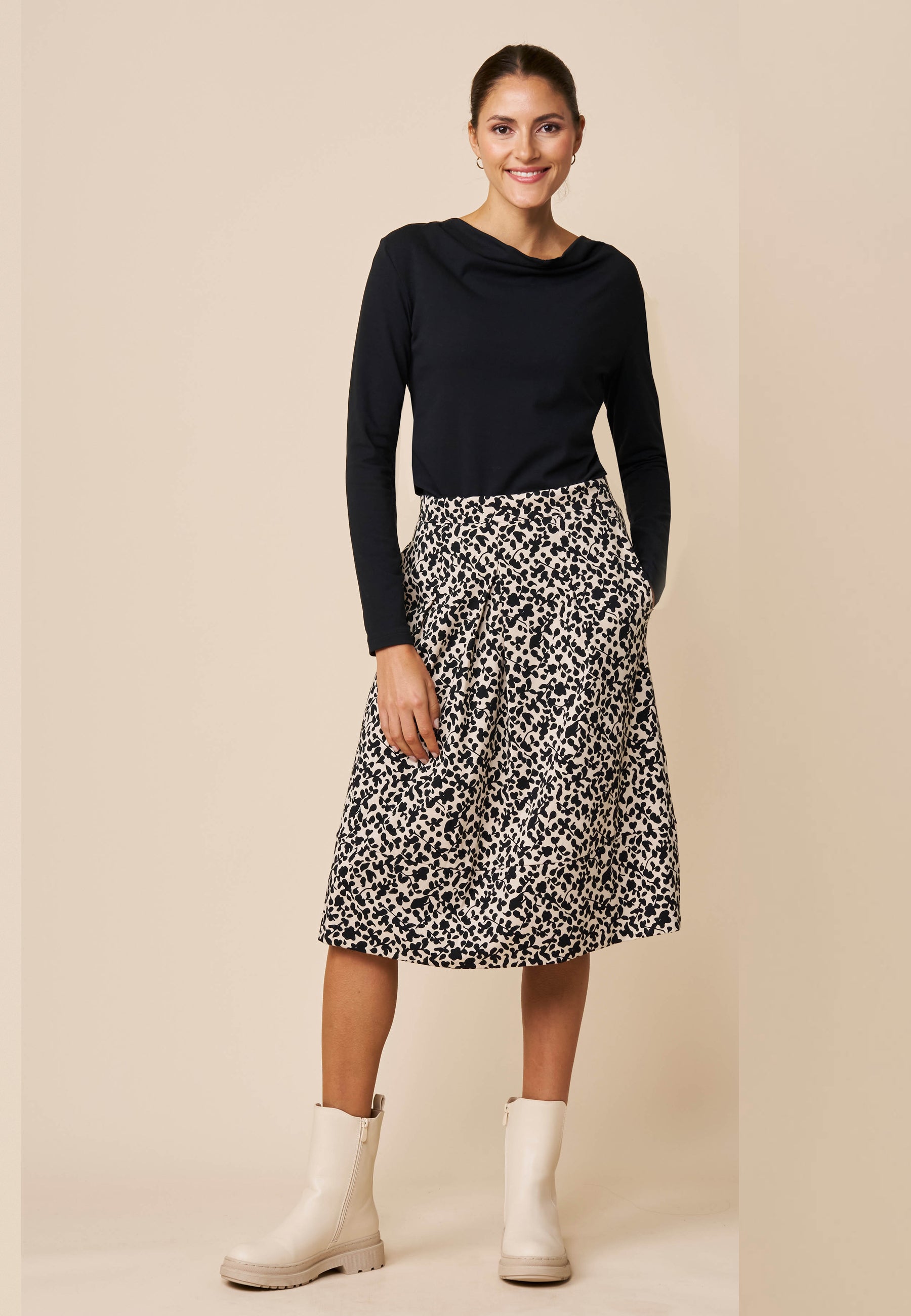 Ein knielanger Rock, der seine schöne Saumweite durch drei, in unterschiedlicher Höhe aufspringende, tiefe Kellerfalten im Vorderteil erhält. Geschlossen wird er in den hinteren Mitte mit einem Knopf und Reißverschluss. Die breite, doppelt gelegte Saumblende, Iässt das Rockvolumen voller und eleganter fallen.