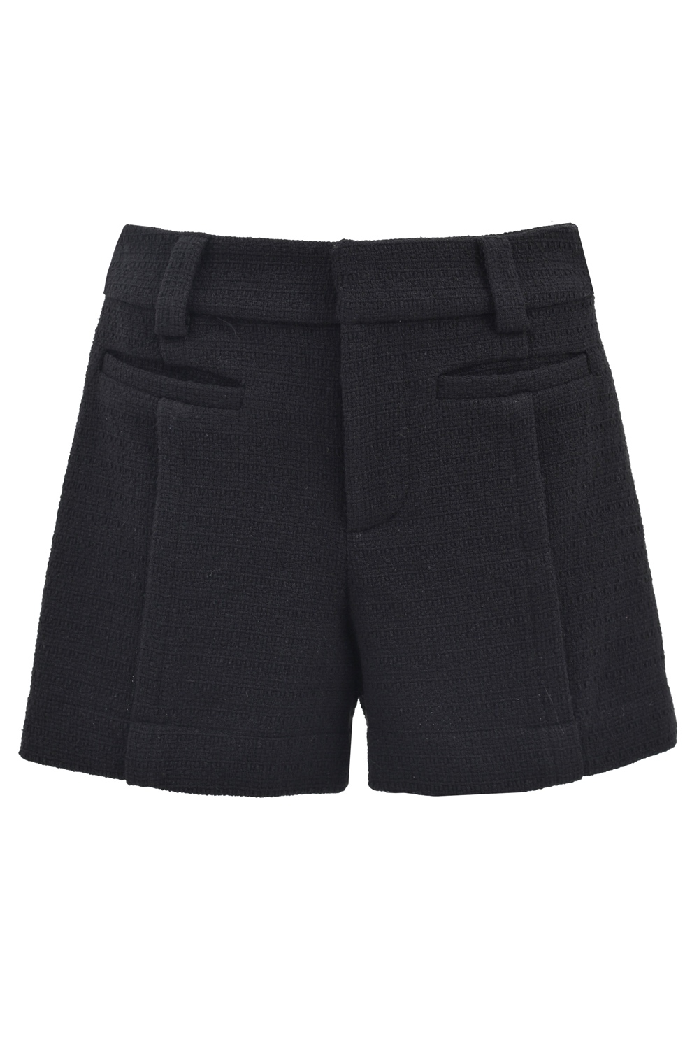 Black tweed shorts perfect for the summer, complementing the styling with the Enteliér tweed jacket. The cut of the shorts is elegant and comfortable at the same time. The shorts are on the belt with belt loops, fastened with a zipper at the front, have decorative pockets at the front and stitching on the legs.