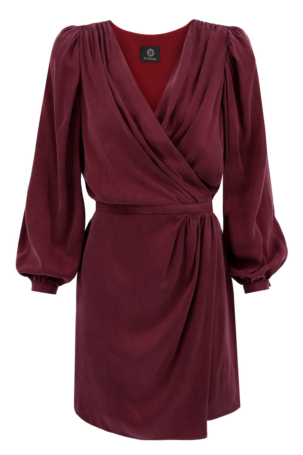 Margot burgundy dress is an elegant cocktail dress. The dress has a closed envelope cut, a slightly loose neckline, and is fastened at the side with a covered zipper. The dress has a sewn-in elastic at the back waist under the fabric, so it adjusts at the waist and hips. The sleeves are buffeted at the shoulders, loose and gathered into a delicate cuff, fastened with a fabric-coated button.