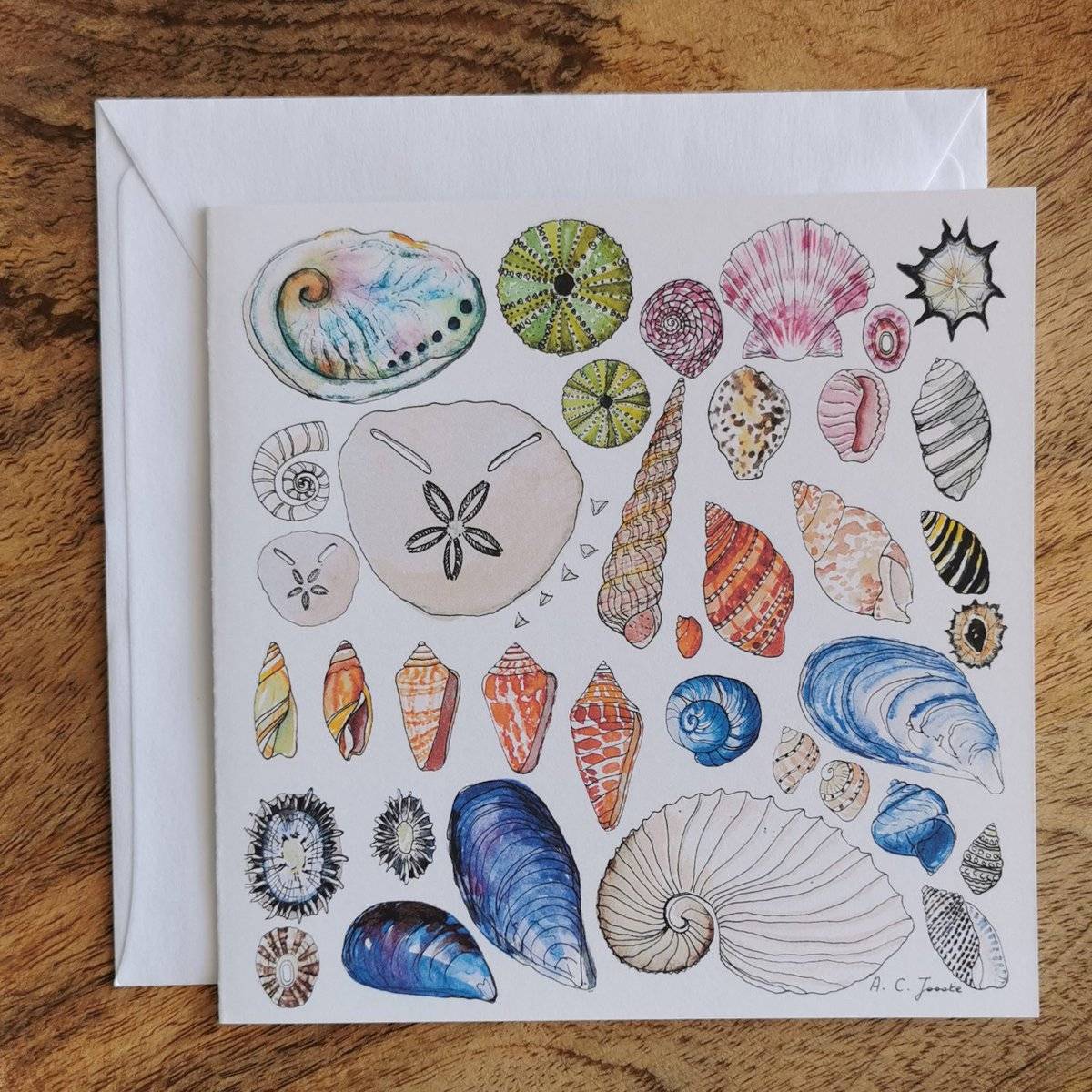 Artworks are printed on a blank square card and each card is accompanied with a white envelope.