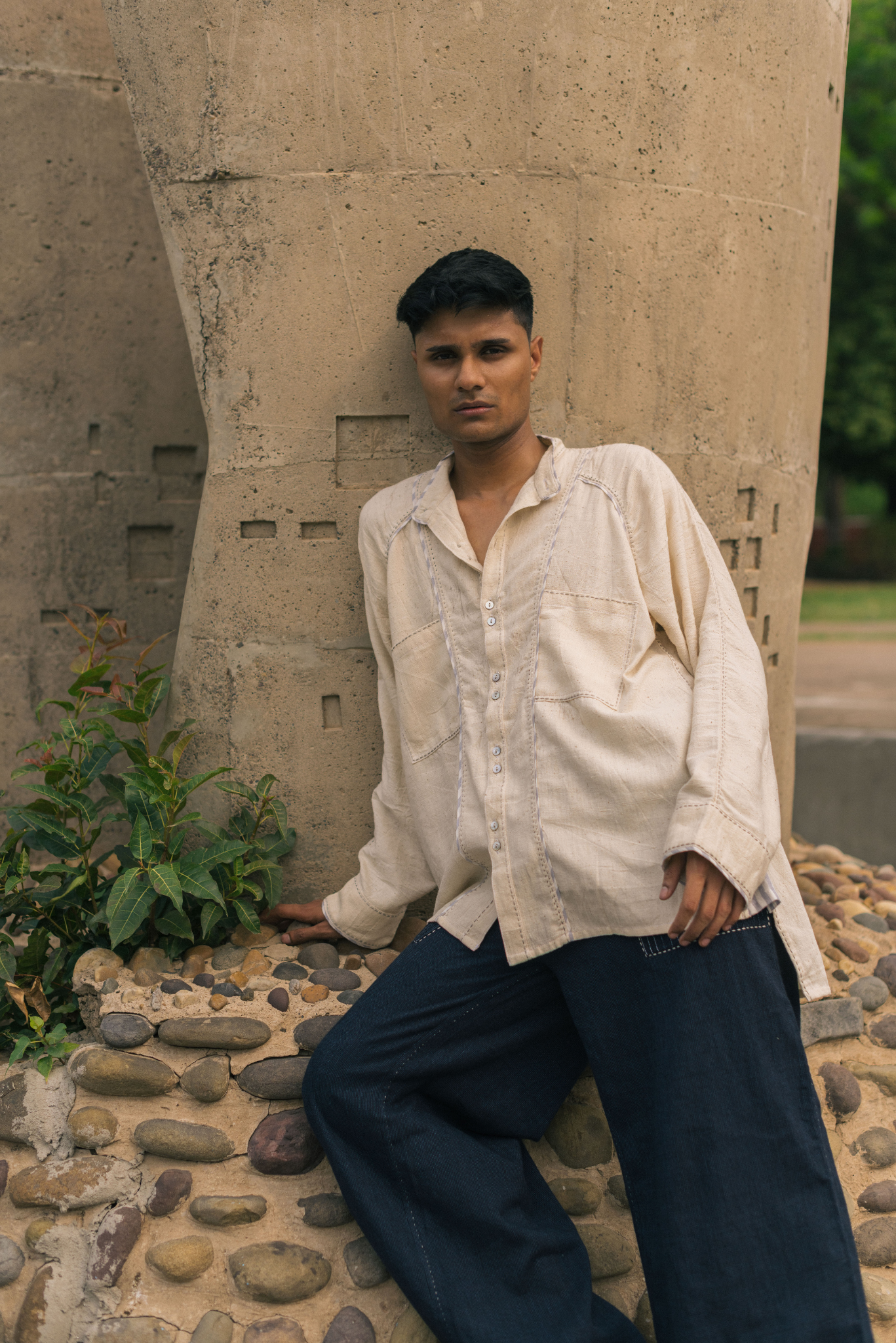 Made from 100% cotton fibres and natural materials, the Seam Shirt is crafted in undyed and unbleached Kora Kala cotton - a soft, textured fabric that holds the natural character of the fibre. Hand-done Kantha embroidery runs along the seams, complemented by piping in grey striped handwoven cotton, subtly framing the garment’s structure.