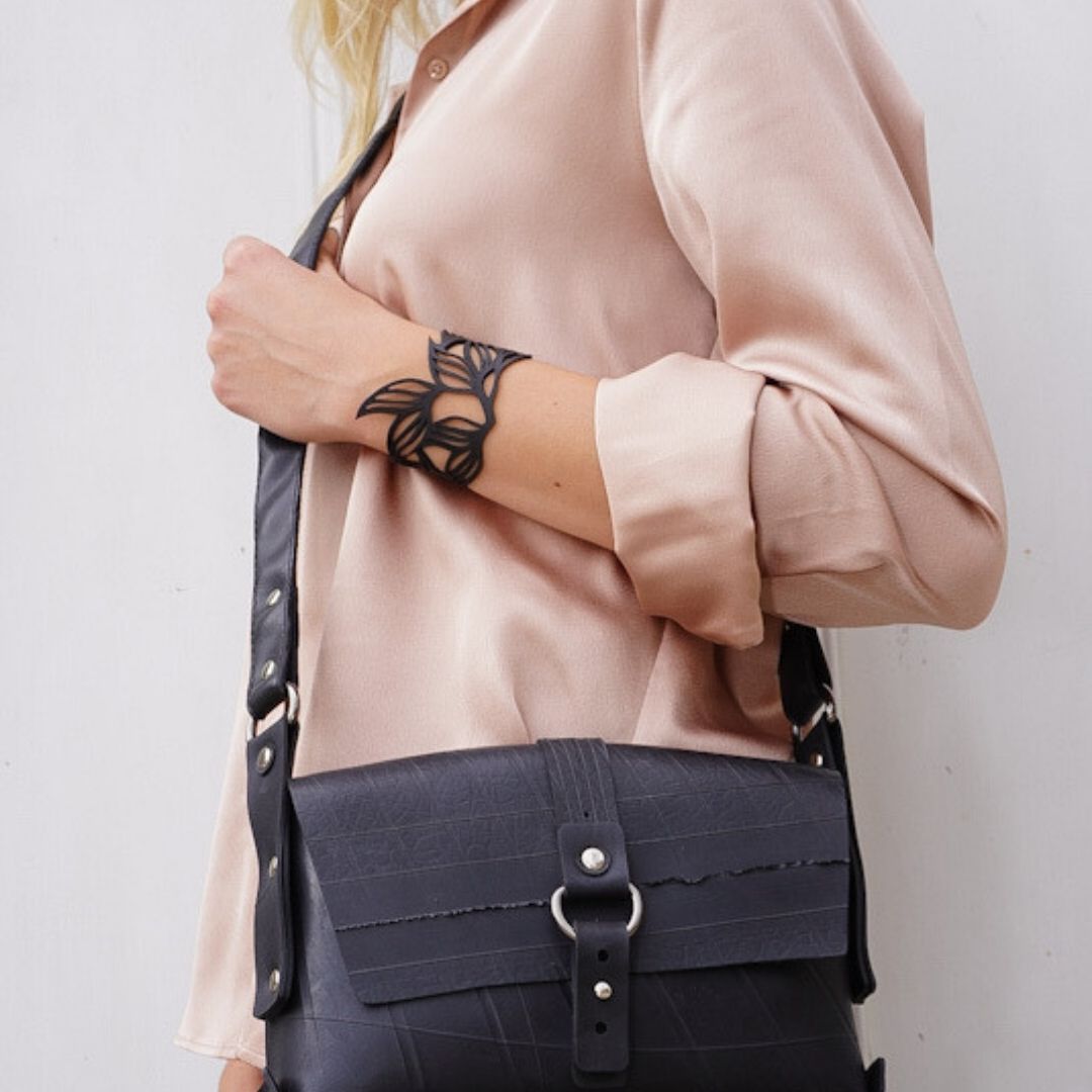 The bracelet has been handcrafted using reclaimed rubber in a way which is both eco-friendly and cruelty-free. Reclaimed inner tubes are a popular leather substitute, due to their similar textures and unique patterns.