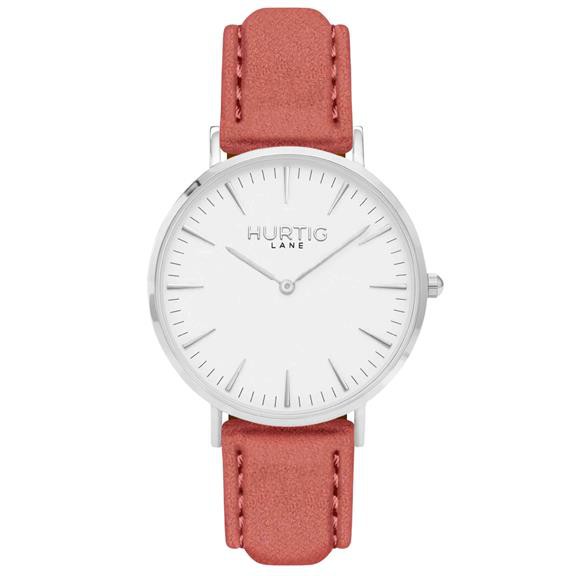 DIAMETER CLOCK 40mmCOLOR FRAME SilverFRAME MATERIAL Stainless steelMECHANISM QuartzWATCH TYPE MiyotaDIAL COLOR WhiteSTRAP COLOR CoralSTRAP MATERIAL: Vegan suedeWATERPROOF 3ATMUrsprung: Shop Like You Give a Damn