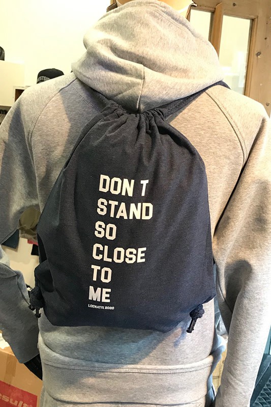 Nice denim backpack made of recycled cotton and recycled polyester. The text 'Don't stand so close to me" is a line from the hit song by the Police. It's also a reminder to keep our social distancing during the pandemic.