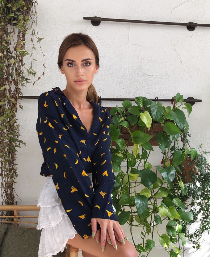 We are willing to add fun to your style with mini polka dot and banana pattern navy blue shirt. This piece that will fit perfectly with your jeans in daily life it has both a comfortable and stylish fit.