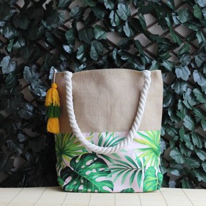 Jute beach bag with monstera pattern; it fascinates with the peace of green.