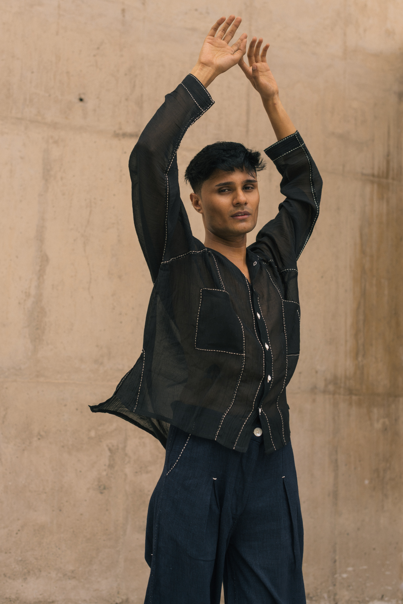 Made from 100% Handwoven Chanderi, the Seam Shirt is Midnight Black azo-free dyed.. The piece features hand-done Kantha embroidery tracing along the seams, adding quiet definition and a tactile rhythm to the silhouette.