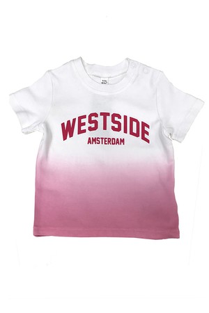 This nice baby t-shirt is specially for our little Amsterdam boys and girls. The shirts have a gradient colour from surf blue to white and from pink to white. The Westside print is a ton-sur-ton suede flockprint and is made of 100% organic cotton.