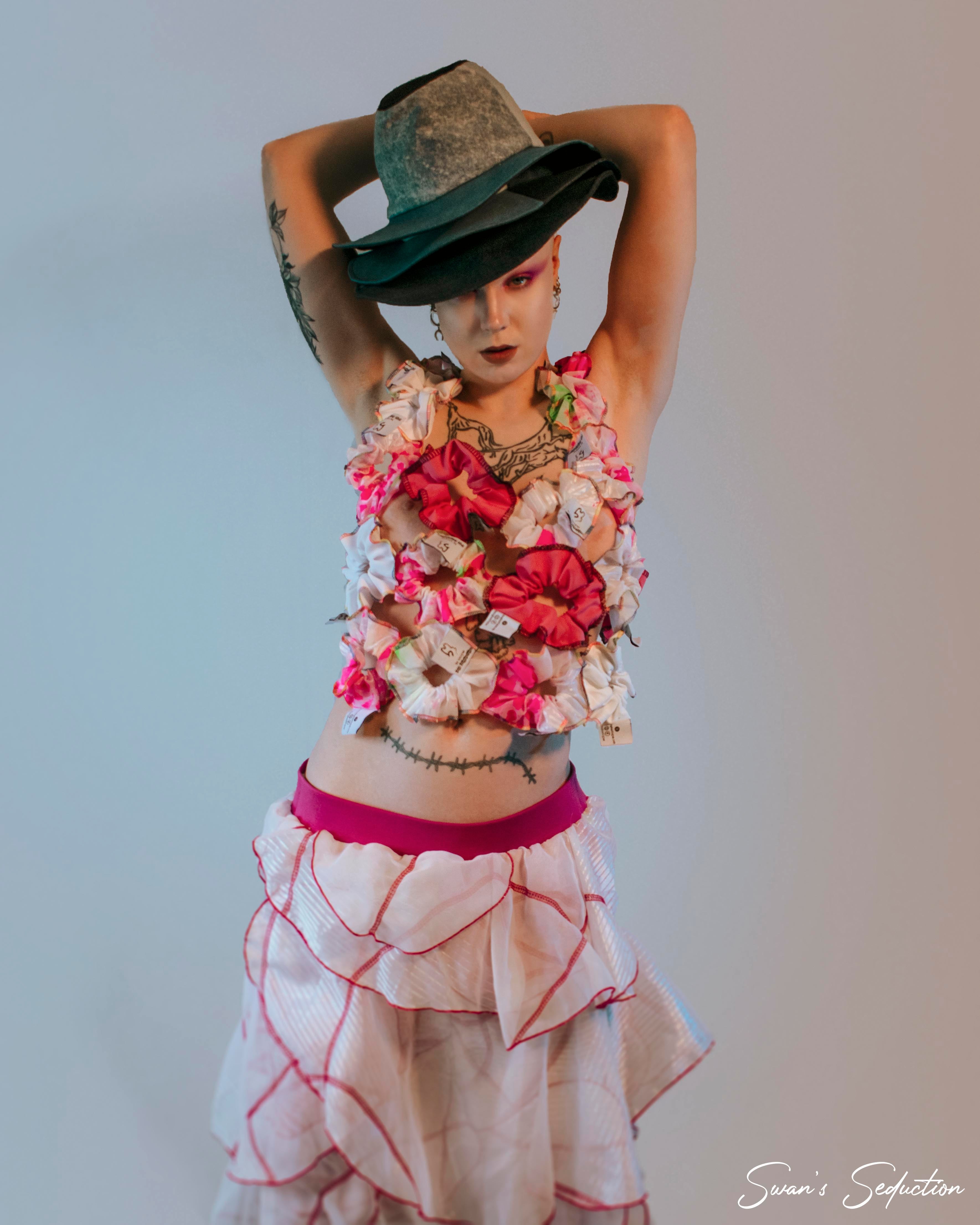 This one of a kind top is part of the Leftover Lover collection. This design is made from pink and white scrunchies, made from fabric scraps.