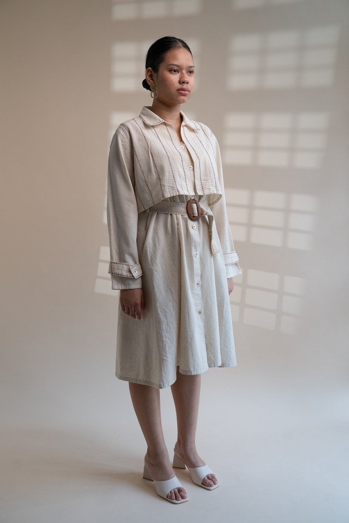 This Dawning Dress and Cropped Jacket set come in a calm and soothing colour that we call Kora.Crafted in 100% organic cotton fibres and natural materials. This 30s cotton dress and jacket set is undyed and unbleached. The dress has an interesting play of warm brown Kantha stitches at alternating lengths from the shoulder and comes with an adjustable and detachable belt adorned with the stitches of Kantha, a form of Indian hand embroidery, creating an ombre effect.The Model is 5'3" tall and is wearing an M/L.
