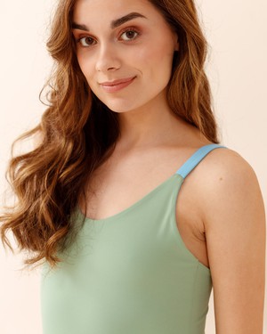 The Lily swimsuit features a pistacio tone on one side and light blue on the other, ideal for switching up your beach look with ease.