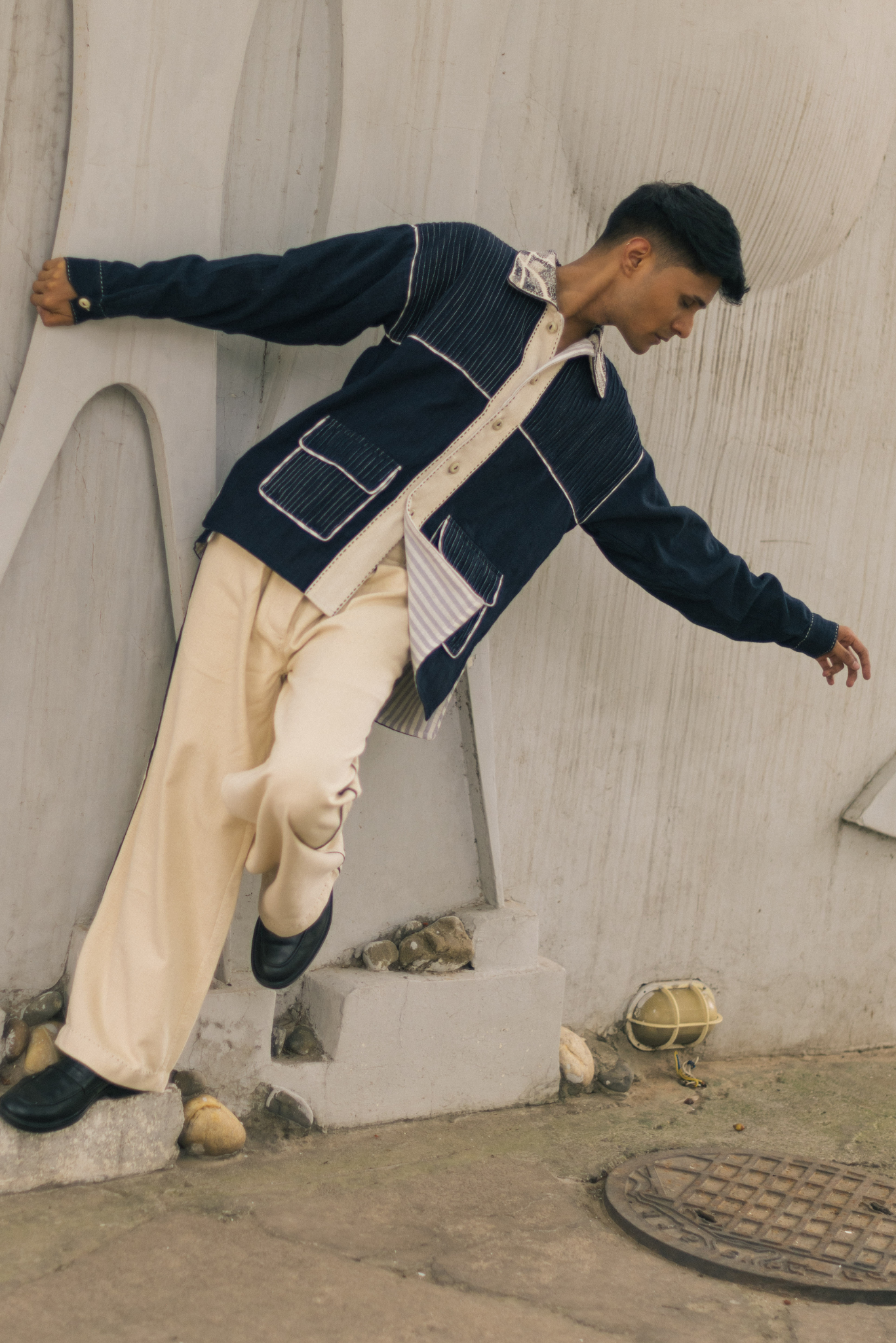 The silhouette features patch pockets with flaps and contrast piping along the edges, framing the form. The collar stands out as a focal point - densely embellished with reimagined Kantha embroidery that elevates the piece with tactility and craftsmanship.