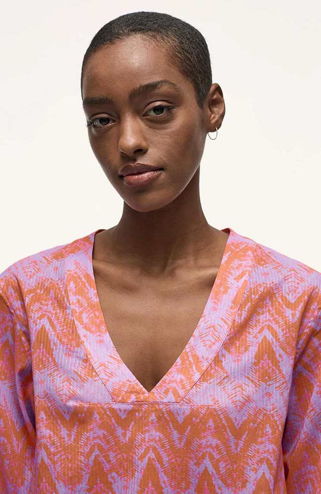 Beautiful summer blouse in lilac with coral red and an abstract print from our new brand LANIUS. It features a V-neckline, straight fit and 5/6 sleeves with small cuffs. Made of organic cotton. The color is best seen in the 1st photo: bright orange/red with lilac purple.