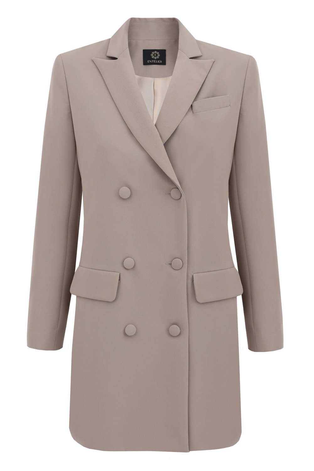 Jacket dress beige is an elegant dress with the cut of a classic longer jacket. It is fastened with double-breasted buttons and is waisted. The buttons are coated with fabric. The color of the jacket is a shade of cool stone beige.
