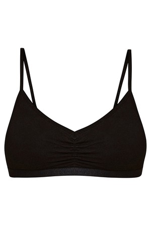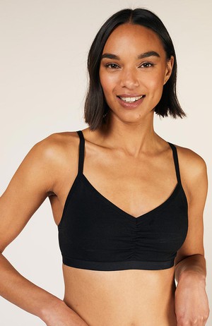 Black bra without bracket and with v-neck from the Organic Underwear collection of People Tree. This soft bra has adjustable shoulder straps, a wide back strap and offers medium support. The firm, non-transparent and lovely soft material makes her comfortable and the wrinkled detail at the front flattering.