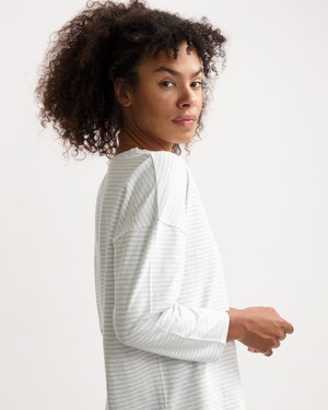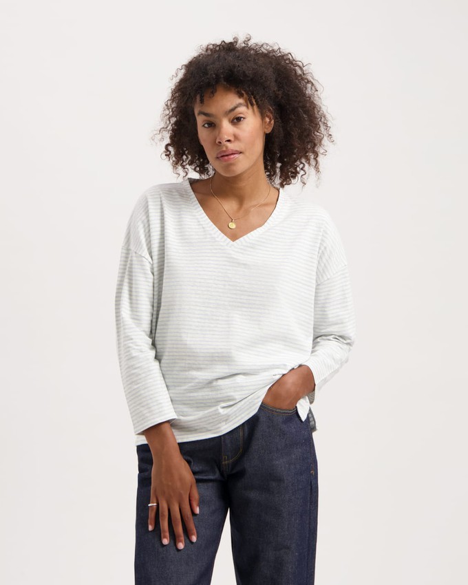 Dieses gestreifte Langarmshirt hat überschnittene Schultern und eine entspannte Passform. Das Damen-Langarmshirt besteht aus einer weichen Mischung aus Hanf und Bio-Baumwolle. Dank der natürlichen Fasern fühlt sich der Stoff leicht und atmungsaktiv an – perfekt für den Alltag.